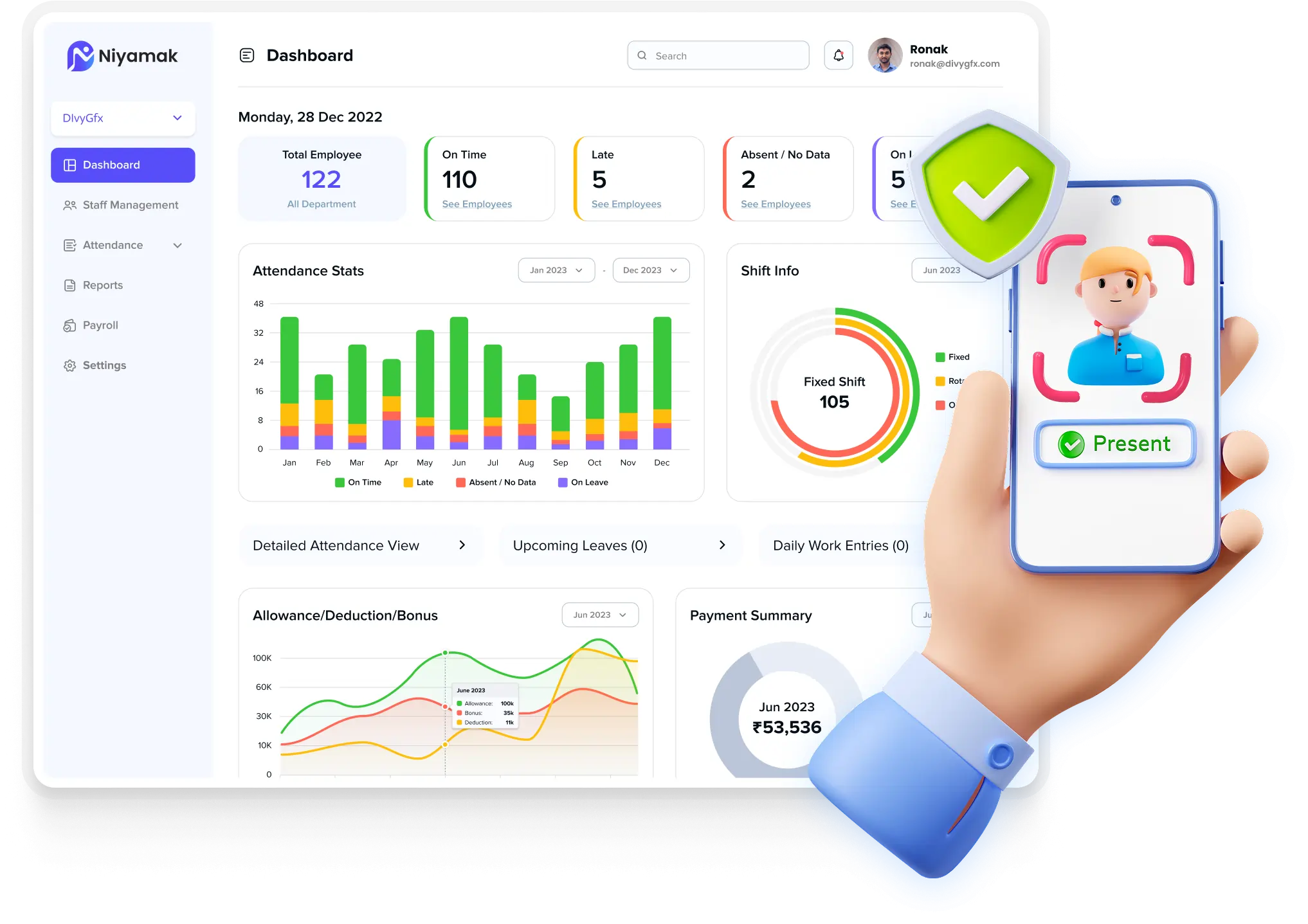 Manage your staff attendance, salary details and compliances in few clicks + attendance based with face biometric